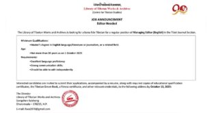 Job AnnouncementEditor Needed The Library of Tibetan Works and Archives is looking for a bona fide Tibetan for a regular position of Managing Editor (English) in the Tibet Journal Section. …