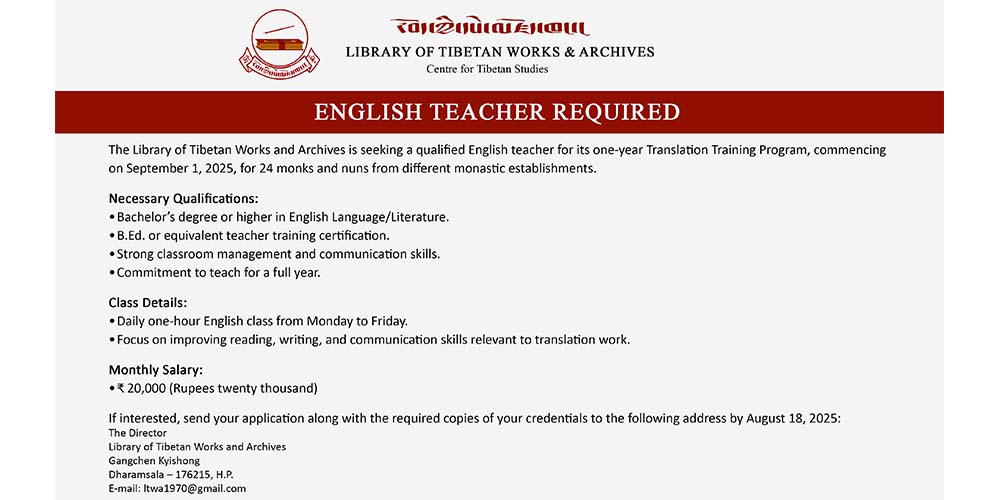 The Library of Tibetan Works and Archives is seeking a qualified English teacher for its one-year Translation Training Program, commencing on September 1, 2025, for 24 monks and nuns from different monastic establishments.